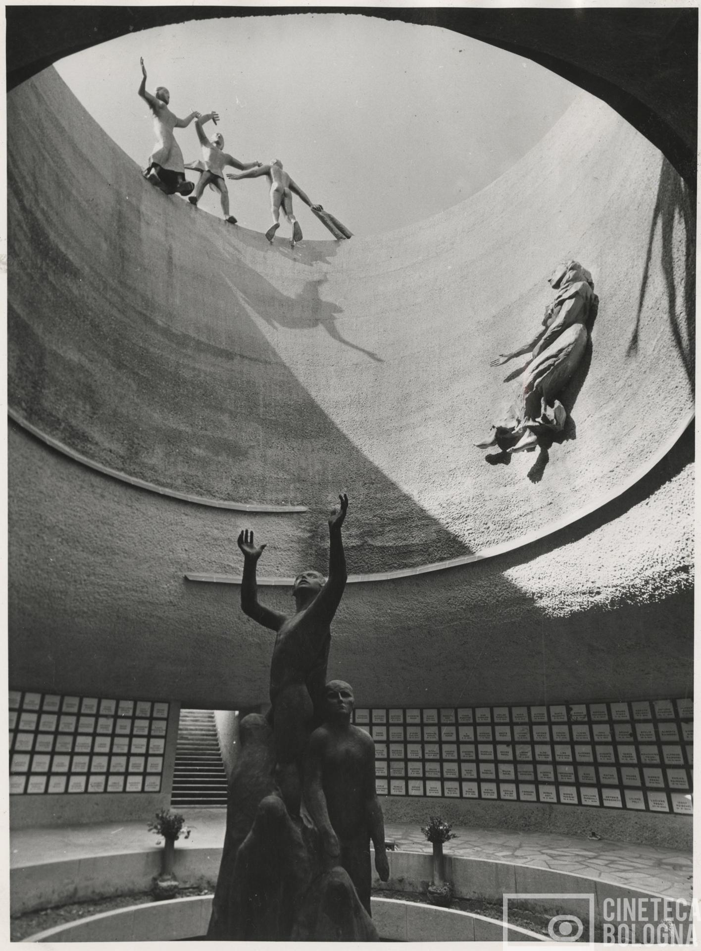 Il Monumento-Ossario ai partigiani caduti, situato presso il Cimitero monumentale della Certosa di Bologna, fu inaugurato il 31 ottobre 1959 per volontà del sindaco Giuseppe Dozza, figura centrale della Resistenza e della ricostruzione cittadina. Il progetto fu affidato a Piero Bottoni, architetto milanese vicino al Razionalismo e al pensiero di Le Corbusier, che concepì un'opera di grande forza simbolica. Ad arricchire l'architettura intervennerole sculture in lamina di bronzo di Genni Wiegmann Mucci e Stella Korczynska, L'immagine documenta l'equilibrio tra arte, architettura e memoria che caratterizza uno dei luoghi più significativi della Bologna del Novecento. Il monumento, fotografato per l'occasione dallo studio Gfoto Gnani di Bologna, accolse le spoglie di oltre duemila partigiani.